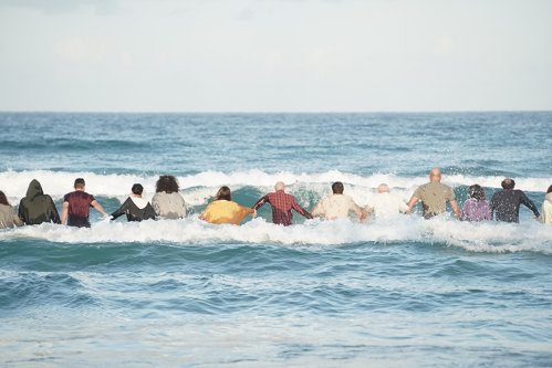 صف من النساء والرجال، يتكاتفون بأيديهم ويدخلون الى البحر في شاطئ تل ابيب باعينٍ مفتوحةٍ حتى تغطيهم المياه بالكامل. هذا العمل المعارض، اللاعقلاني، هو نداء استغاثة كرد فعلٍ على الواقع الأليم، ونداء لوقف الحرب واعادة المختطفين والمختطفات. يقوم هذا العمل الفني، بتحدي النظام القائم شكلًا ومضمونًا، ويسعى لقول شيء مهم للعالم، وبالتالي الى توسيع الوعي والقلب. تحدد هذه المجموعة طريق لمصير مشترك، وتقدم لنا عن طريق لغة الجسد الاصغاء الداخلي، الدعم القوة والمبادئ الانسانية. تعترف هذه المجموعة بضرورة التغيير، والاعتراف بشركائنا في المصير، بالإضافة الى العنصرية وضرورة العمل من اجل تغيير الوضع القائم والى مسؤولية الحلم والعمل من اجل حياة تسودها الطمأنينة والسلام. إنها نظرة نقدية على الوضع القائم وتذكير بأننا جميعا نسيجٌ بشري حي واحد.